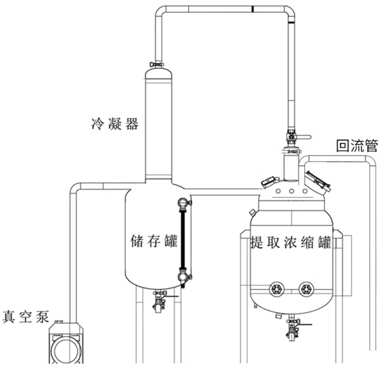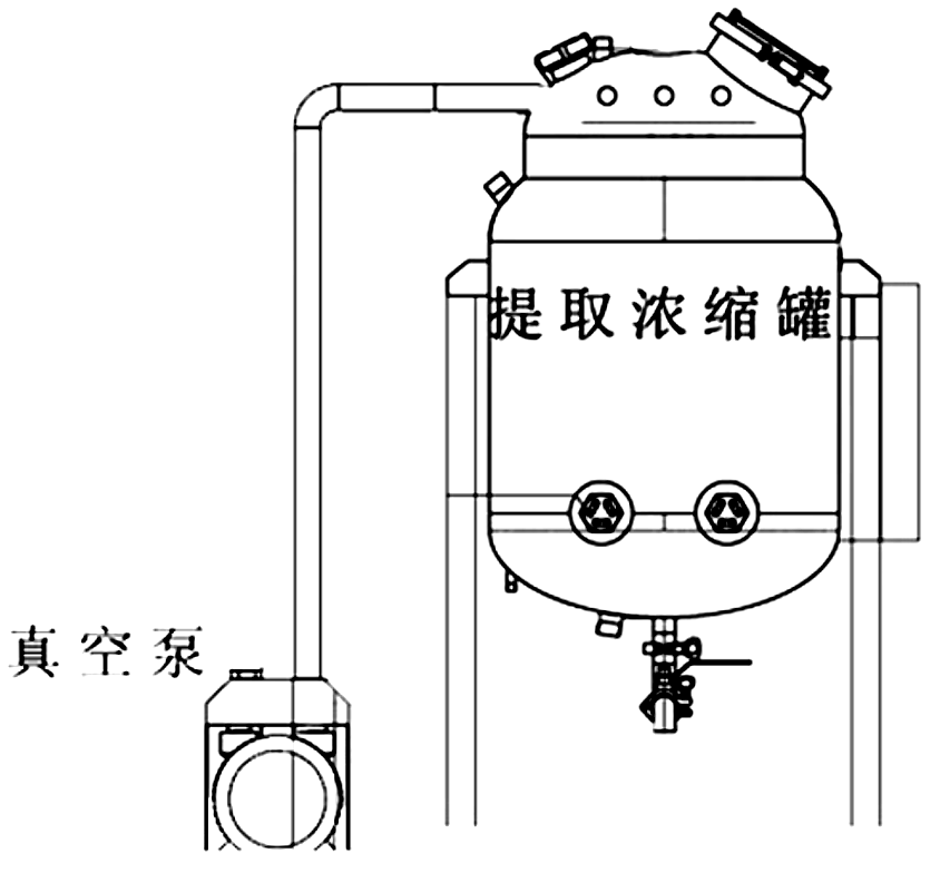藥材提取后放出提取液,倒出藥渣,濃縮罐抽真空后經(jīng)回流管回到