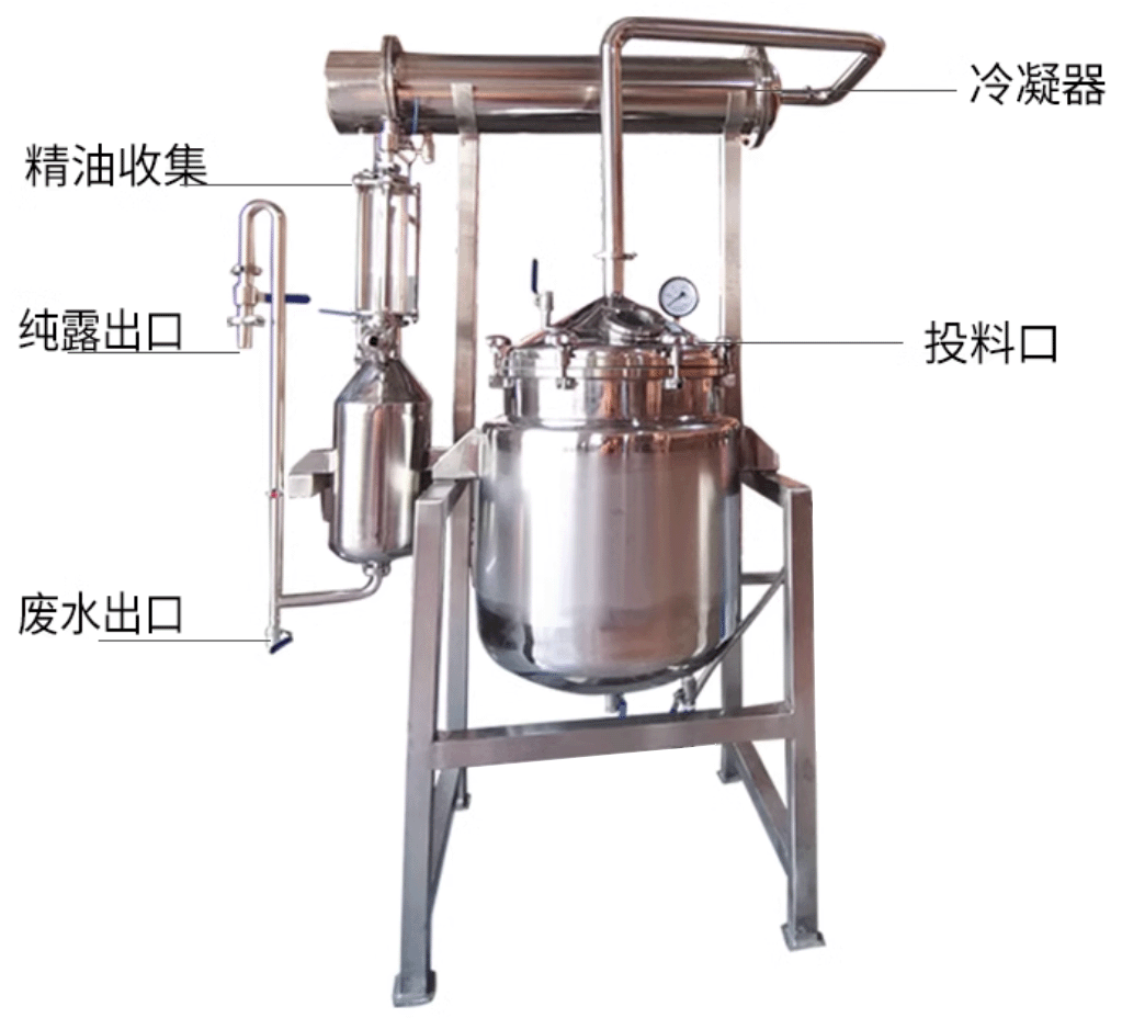個大的不銹鋼蒸餾容器 ( 蒸餾器 ), 在容器 底部加熱 或 通入蒸汽。當(dāng)炙熱的蒸氣充滿在容器里,會將植物內(nèi)存的芳香精油成分隨著水蒸氣蒸發(fā),并且隨著水